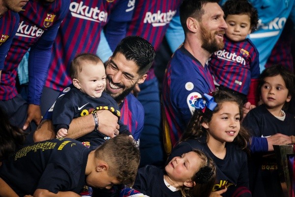 El delantero uruguayo recibió a su hijo más pequeño en brazos para celebrar y hubo muchas imágenes de ambos.