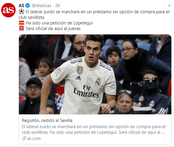 Según avanzó el diarioAs, Reguilón será cedido al equipo del Nervión por toda la temporada, pero no se estableció en el contrato de préstamo una opción de compra, por lo que con seguridad regresará al final de la misma.