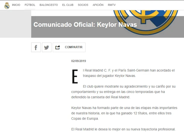 Destacando brevemente “su comportamiento y su entrega”, el Real Madrid le deseó el mayor de los éxitos a Keylor de cara a lo que se le viene mediante un comunicado oficial emitido en las redes sociales.