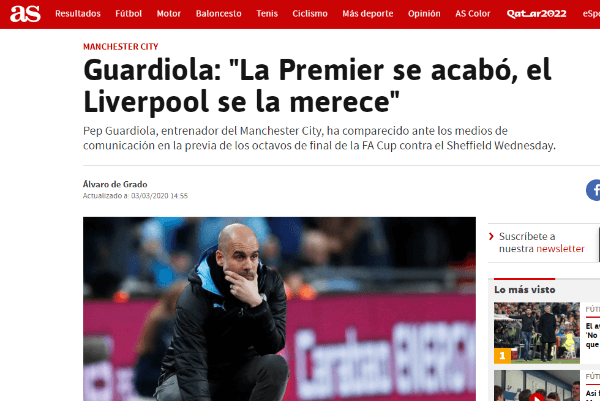 “La liga está acabada y el Liverpool se la merece. Después de tantos partidos, si la ventaja es la que es, es porque se lo merecen”, declaró el catalán.