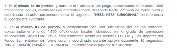 El informe describe que aproximadamente mil aficionados le gritaron al Diez “Messi, Messi subnormal” durante diez segundos. Mientras que al central le cantaron con ritmo “Piqué cabrón, España es tu nación“, en referencia a su identificación con Cataluña.