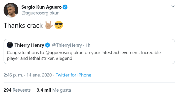 “Felicitaciones Kun Agüero por tu último logro. Increíble jugador y goleador letal. Leyenda”, tuiteó Titi Henry arrobando al futbolista de los Citizens.