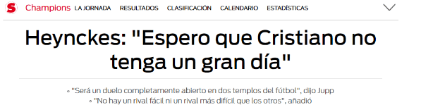 Jupp Heynckes, entrenador del elenco alemán, entiende qué futbolista Blanco puede ser fundamental en la serie:“Espero que Cristiano Ronaldo no tenga un gran día, es junto a Lionel Messi el mejor jugador del mundo”.