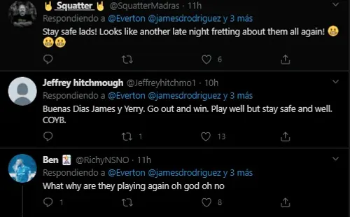 En la mañana, Everton hizo una publicación en su cuenta de Twitter anunciando los jugadores del club que iban a estar presentes en los diferentes partidos internacionales alrededor del mundo y allí señalaron el juego de James y Yerry Mina, quien también está con el equipo nacional.