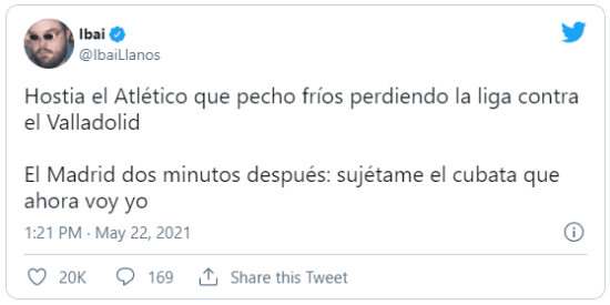 Anonadado por la situación, Ibai Llanos aprovechó para tirar un tuit más que oportuno que no tardó en hacerse viral. “Hostia el Atlético que pecho fríos perdiendo la liga contra el Valladolid. El Madrid dos minutos después: sujétame el cubata que ahora voy yo”, escribió el streamer.