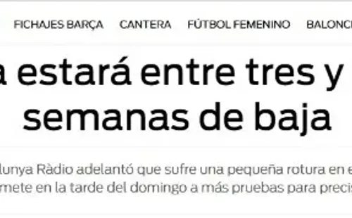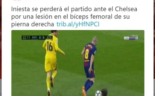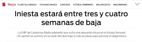 El diario Sport y Marca informaronel tiempo que Iniesta estará fuera de las canchas por una pequeña rotura en el bíceps femoral del muslo derecho, según indicó el parte médico oficial del Barcelona.