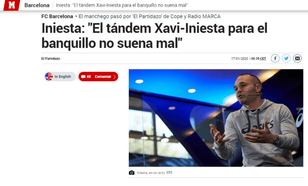 “El tándem Xavi-Iniesta no suena mal, pero no es posible ahora mismo.No he dicho que me gustaría entrenar a un equipo determinado, pero lo de entrenador a medida que pasa el tiempo me va gustando”, declaró el jugador delVissel Kobe.
