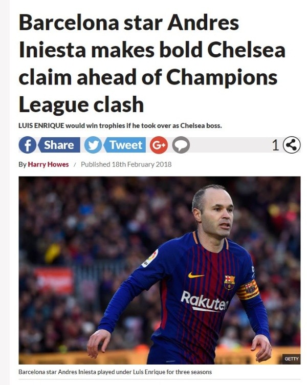 Andrés Iniesta recomiendaa Luis Enrique para que sea el próximo técnico delChelsea, según indica el diario británico Daily Star.