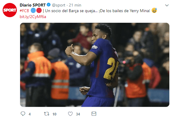 Sin embargo, la máxima atención la protagonizóYerry Mina, al asegurar el Síndic del Soci que le llegó el requerimiento de un socio blaugrana pidiendoa Yerry Mina que no fuera tan efusivo en sus bailes, en el momento de celebrar sus goles, para no herir la susceptibilidad del equipo contrario.