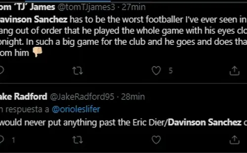 Lamentablemente para el colombianoDávinson Sánchez él fue uno de los señalados por la hinchadas de los Spurs ya que ha tenido una temporada bastante floja y su presentación hoy dejó mucho que desear, lo cual desató una lluvia de críticas en las redes sociales.