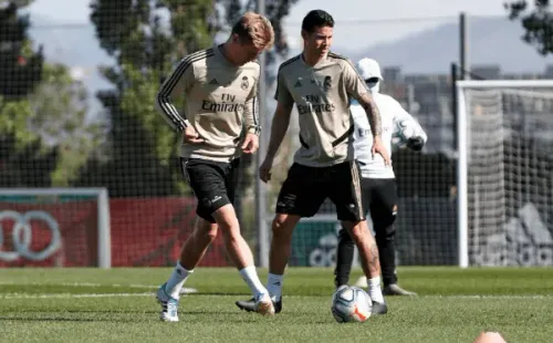 ElReal Madrid, con el colombiano James Rodríguez,completó su segundo entrenamiento de la segunda semana de preparación en la ciudad deportiva de Valdebebas, recuperando sensaciones perdidas con balón en el trabajo dividido en grupos, con sus futbolistas disputando la posesión y disfrutando del trabajo ya con compañeros.