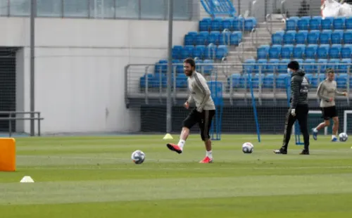 En las imágenes se puede ver a hombres como James en trabajo con pelotas, también Eden Hazard, corriendo sobre el césped. El belga vuelve a ejercitarse después que el pasado 5 de marzo fuese operado en Estados Unidos de una fisura en el peroné derecho. También se puede ver al técnico blanco Zinedine Zidane portando una mascarilla mientras da instrucciones.
