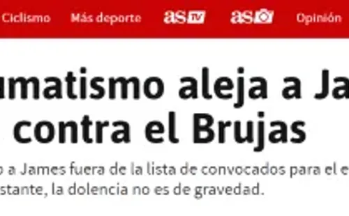 Y el medio agrega: “James tan sólo había disputado 13 minutos en el derbi del pasado sábado, ytodo parecía indicar que iba a ser titular este martes, en la segunda jornada de la Champions.Sin embargo, este contratiempo físico le ha alejado de esa posibilidad. De todos modos,el propio James confía en estar a tope para el partido del próximo sábado contra el Granada”.
