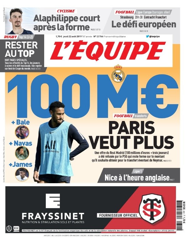 Pero cuando parecía que se abría la puerta para que uno de los grandes de Europa sea el futuro de James, el 10 colombiano ha sido rechazado, según el diario francés L’Equipe, el Real Madrid ofreció a Keilor Návas, Garet Bale, James Rodríguez más 100 millones de euros por el brasilero Neymar, pero la oferta fue rechaza por los franceses. Queda poco para que se cierre el mercado europeo y el colombiano no aclara su futuro.