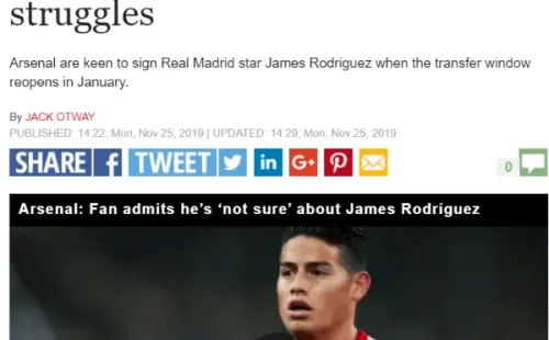 “El internacional colombiano se ha encontrado vinculado con Arsenal en medio de la rocosa campaña de la Liga Premier de los londinenses hasta el momento.Arsenal se ha encontrado sin creatividad en medio de sus luchas bajo el mando del entrenador Unai Emery, con Mesut Ozil a menudo excluido”, asegura la publicación.