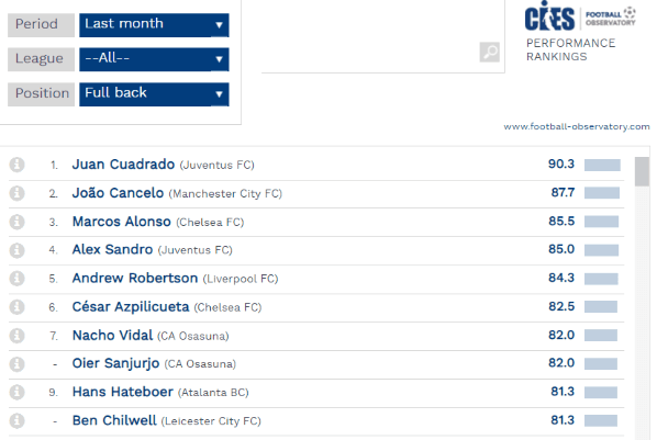 El Observatorio del Fútbol CIES publicó su último ranking con los mejores jugadores de estas ligas y en la posición de lateral Cuadrado lidera la lista con una calificación de 90.3, superando a Joao Cancelo, del Manchester City, y Marcos Alonso, del Chelsea.