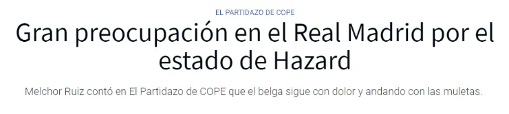 Según la cadenaCope, Hazard todavía sigue en muletas por el dolor que le provocó el golpe en su tobillo derecho.