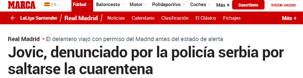 Según publicó el diario Marca, el futbolista de Real MadridLuka Jovic no la cumplió: fue denunciado por la policía serbia por saltarse la cuarentena en su país.