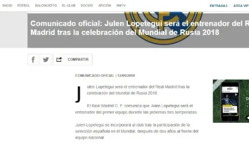 De manera sorpresiva, el club comunicó de manera oficial que el actual técnico de la Selección de España, Julen Lopetegui, ocupará ese cargo una vez finalizado el Mundial de Rusia 2018.