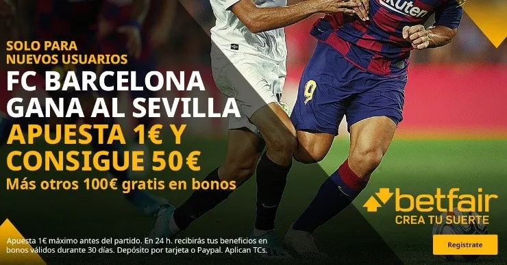 Pero al mismo tiempo, betfair te invita a participar de una espectacular promoción para nuevos usuarios: Si crees que Barcelona gana a Sevilla, apuesta 1€y consigue 50€, más otros 100€en bonos que esperan por ti en este partidazo de Liga. Consulta los términos y condiciones de la promoción.