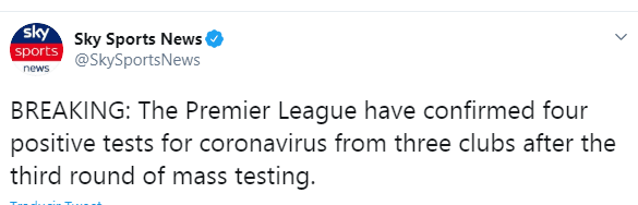 En total, ya son doce los casos que se han detectado en la máxima división del fútbol inglés, a la que todavía le quedan por jugarse nueve jornadas. Además, han sido 1008 los test contra COVID-19 que se han realizado en los últimos dos días (lunes y martes) tanto a los jugadores profesionales como al personal de todo el plantel de cada equipo.