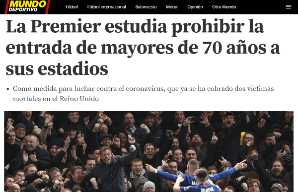 Según informó Mundo Deportivo, en Gran Bretaña prohibirían el ingreso de mayores de 70 años a los estadios. Una propuesta que llama mucho la atención y que podría aplicarse a partir de la próxima fecha.