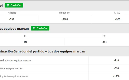 Betway te cuenta sus cuotas especiales para este juego, si crees que ambos equipos marcarán, paga +110, y si piensas lo contrario paga -154 en los momios. Y si eres de quienes creen que el Napoles gana, pero ambos marcan, paga +210, contrario a los +1600 que paga el triunfo del SPAL con ambos equipos marcando goles.
