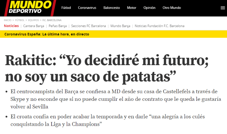En diálogo con Mundo Deportivo, Rakitić, rememorando el último mercado de pases, instancia en la cual el Barcelona lo puso en la rampa de salida y aguardó por ofertas para desprenderse del futbolista, indicó: “Entiendo la situación, pero yo no soy un saco de patatas con el que hacer cualquier cosa. Conmigo siempre se puede hablar, pero lo más importante: quiero estar en un lugar donde se me quiere, se me respeta y se me necesita y donde tanto yo como mi familia nos sintamos bien”.