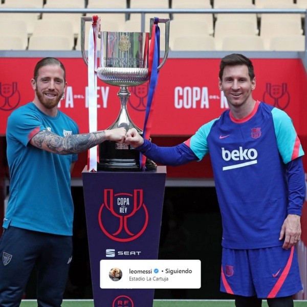 Este viernes, en la previa del encuentro, el Diez y capitán del Barcelona salió a reconocer el campo de juego y a sacarse una protocolar foto junto aIker Muniain, capitán del Athletic Club, y al trofeo de la Copa del Rey. Un cordial saludo de puños en el medio del estadio que albergará mañana la final.