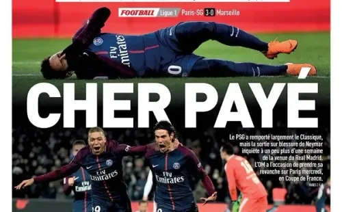 “El PSG ganó el Clásico, pero la salida por lesión de Neymar preocupaapenas una semana antes que llegara el Real Madrid”,titula el principal diario deportivo de Francia.