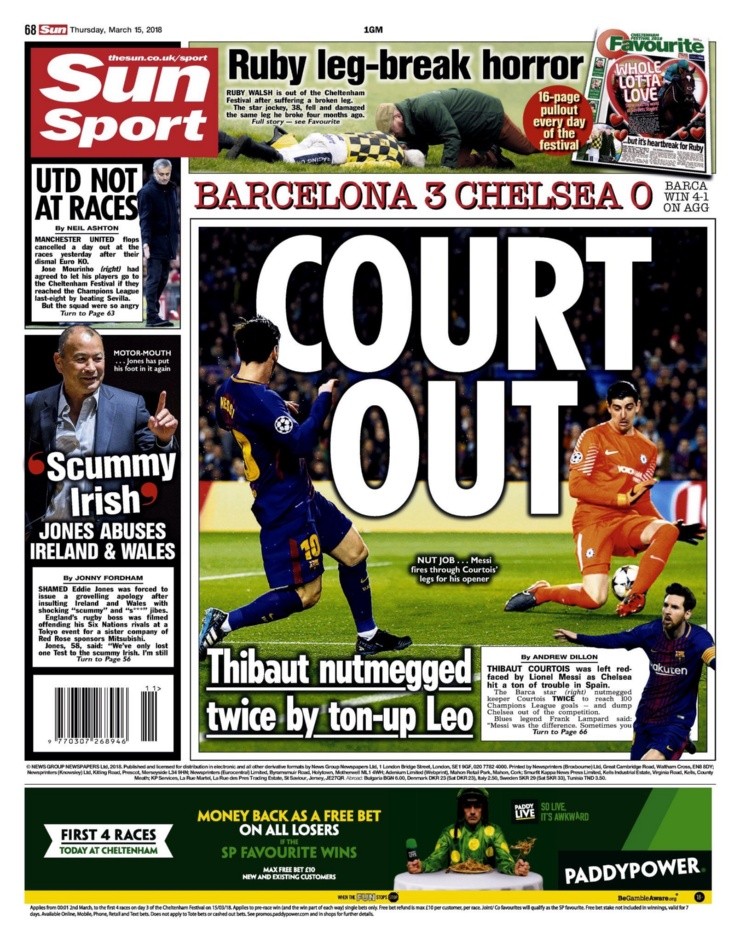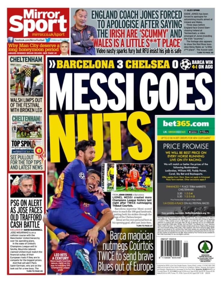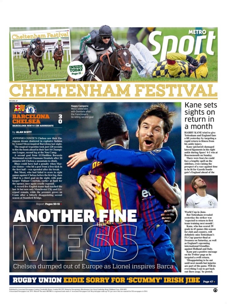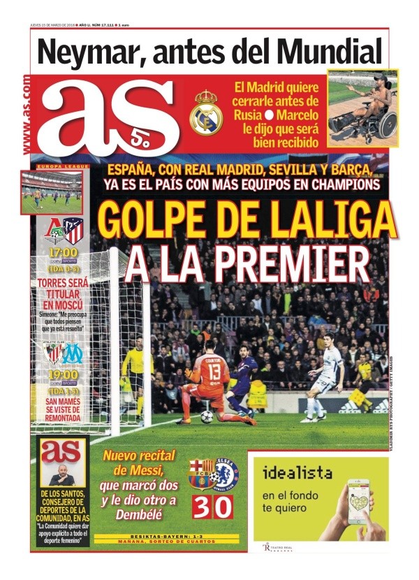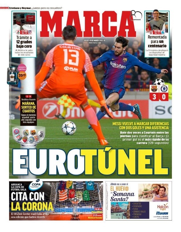 Los diarios Marca y AS, de Madrid, remarcan los dos goles de túnel que Messi le convirtió a Courtois y la presencia de tres equipos de La Liga en los cuartos de final de la Champions League: Barcelona, Real Madrid y Sevilla.
