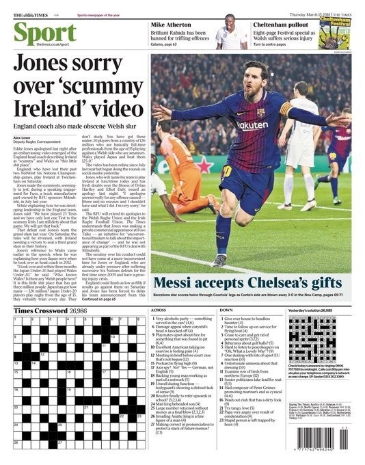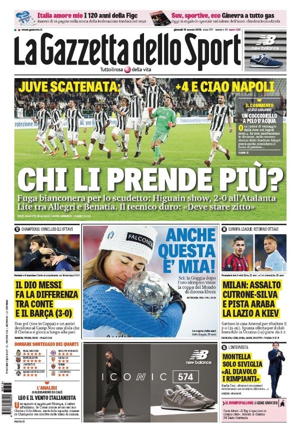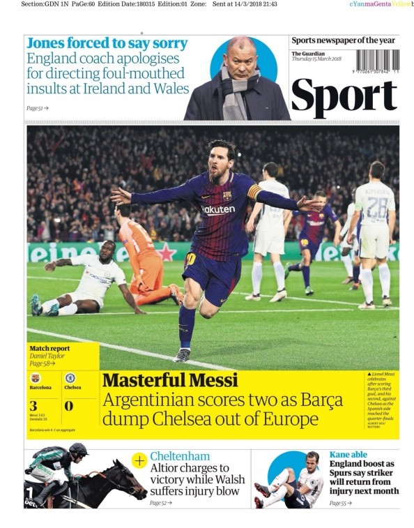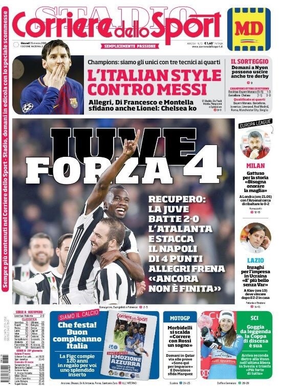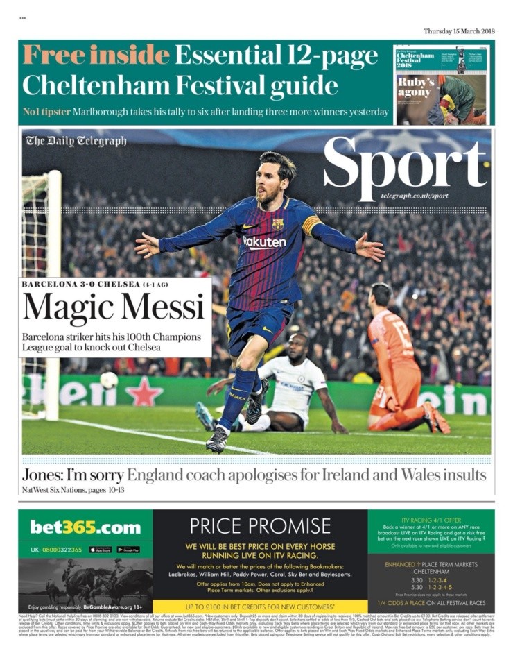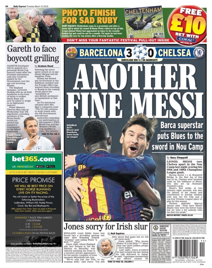 Los diarios Marca y AS, de Madrid, remarcan los dos goles de túnel que Messi le convirtió a Courtois y la presencia de tres equipos de La Liga en los cuartos de final de la Champions League: Barcelona, Real Madrid y Sevilla.
