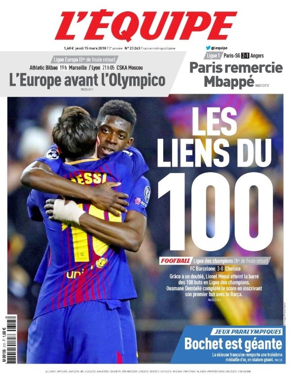 Messi también está en las portadas de los diarios de Francia, como L’Equipe, que lo muestra celebrando junto al francés Dembélé, y en los periódicos de Italia.