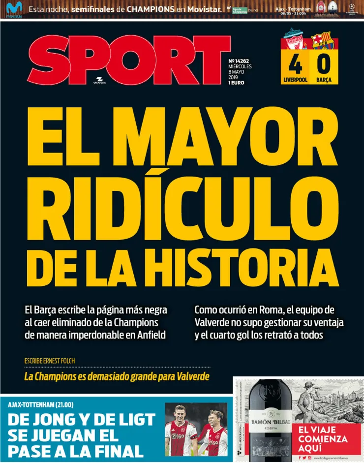 En España, los medios destrozan a los jugadores y al entrenador, Ernesto Valverde, después del 0-4 contra Liverpool.