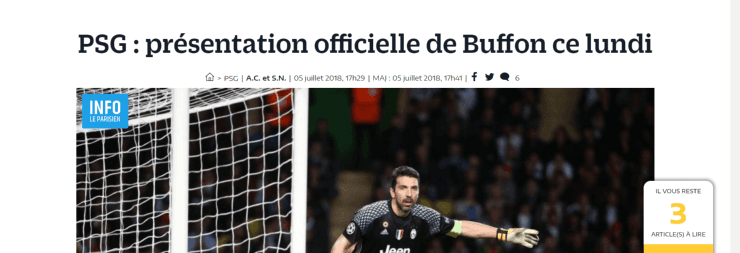 Le Parisien,diario de la capital francesa, afirma que Buffonserá presentado el próximo lunes en el PSG, equipo que adquirirá su ficha tras haber quedado libre. ¡Qué refuerzo!