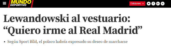 Bueno, según publicó el peridócio Sport Bild, Lewandowski le habría comentado al vestuario su deseo de partir al Merengue.