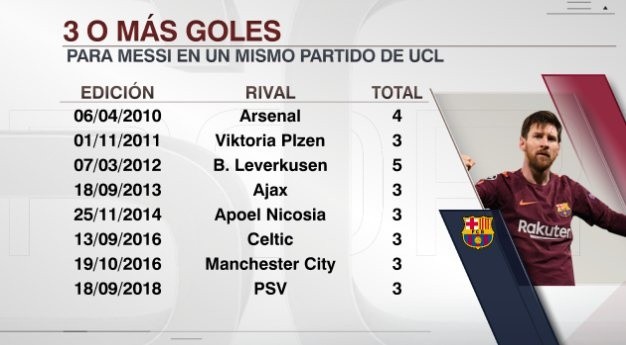 Con el hat-trick, La Pulga llegó a ocho en Champions en lo que lleva de su carrera. En consecuencia, el jugador pasó a Cristiano Ronaldo y quedó en soledad como el jugador con más tripletes marcados en dicha competencia.