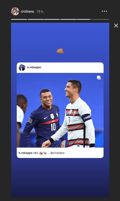 Haciéndose eco del posteo que el francés le dedicó, el ex hombre del Real Madrid no tardó en dejar al desnudo su agradecimiento por el mismo. Comentando y citando la publicación de Kylian, Cristiano respondió con el emoji de un puño cerrado a modo de gratitud por el gesto de Mbappé.