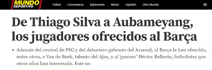 Este miércoles,Mundo Deportivopublicó un artículo donde menciona los jugadores que podría fichar en el próximo régimen de transferencias. Principalmente, nombra acuatro futbolistas que han sido ofrecidos al Barcelona. Las situaciones de ellos son muy distintas, pero el común dominador es el club azulgrana.