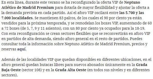 “Se ha reconfigurado la oferta VIP deNeptuno Atlético de Madrid Premiumpara dotarla de mayor flexibilidad y ajustar la oferta a la demanda prevista en cada partido”,informó el club.