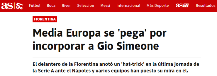 Según afirmó el diario AS, el artillero que se viene destacando y teniendo un papel más que interesante en la Fiorentina de Italia comenzó a llamar la atención luego de su hat-trick ante el Nápoli.