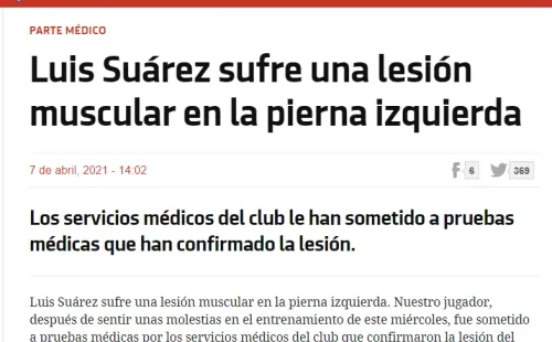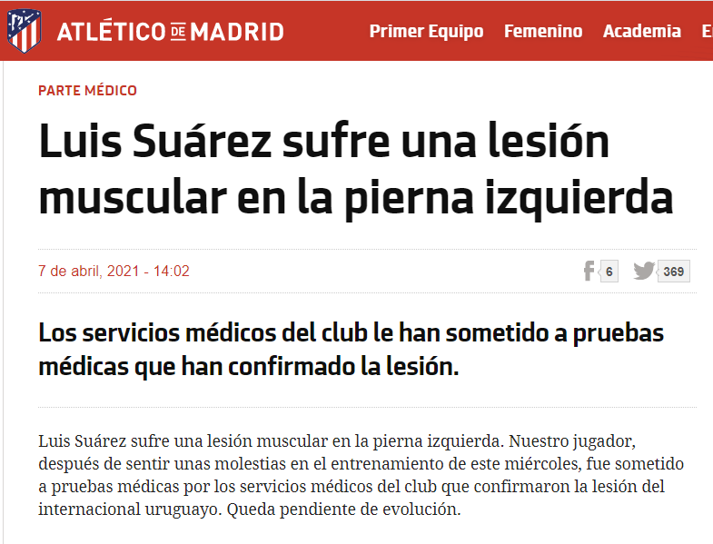 “Luis Suárez sufre una lesión muscular en la pierna izquierda. Nuestro jugador, después de sentir unas molestias en el entrenamiento de este miércoles, fue sometido a pruebas médicas por los servicios médicos del club que confirmaron la lesión del internacional uruguayo. Queda pendiente de evolución”, dice el comunicado oficial.