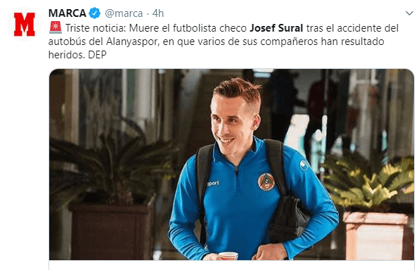 El fútbol mundial ha tenido que lamentar esta mañana una nueva pérdida. Josef Sural, seleccionado checo, murió a los 28 años en un accidente de tránsito.