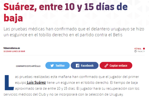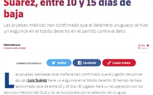 Barcelona comunicó a través de un informe médico que el uruguayo, autor de un gol ante Betis, sufrió un esguince en el tobillo derecho que lo tendrá inactivo entre 10 y 15 días.