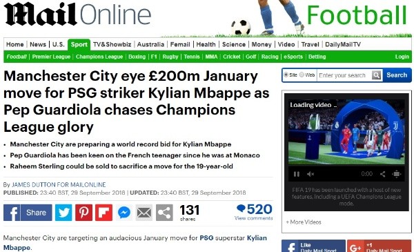 Según informa el ‘Daily Mail’, los ‘Ciudadanos’ estarían preparando una oferta realmente histórica por KylianMbappé, joven crack francés de Paris Saint-Germain. La misma se traduciría en 224 millones de euros.