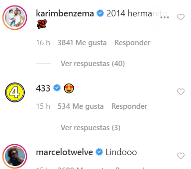 Pero en esta red social aparecieron muchos de los jugadores del Real Madrid a comentarle, pero los que llamaron más la atención fueron los de Marcelo y Karim Benzema, dos de sus grandes amigos en la plantilla.