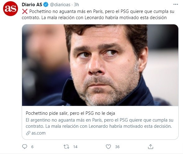 Sus problemas personales y laborales con Leonardo en cuanto al poder que tienen las estrellas dentro del club fueron el detonante de una relación que ahora mismo, mantiene al PSG fracturado. Le Parisien asegura que Pochettino ha pedido formalmente su salida para regresar a Tottenham, algo que desmientes desde el club francés. Con un contrato que le amarra a tierras galas hasta 2022, no hay grandes chances para pensar en un Poch afuera de la Ligue One a corto plazo.