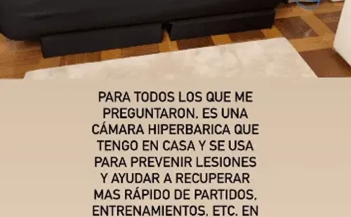 “Para todos los que me preguntaron, es una cámara hiperbárica que tengo en casa y se usa para prevenir lesiones y ayudar a recuperar más rápido después de los partidos, entrenamientos, etc. En la cual se respira oxígeno puro a una presión tres veces más que la atmosférica. PD: mañana no estaré en el partido por una simple gastroenteritis familiar”, explicó.