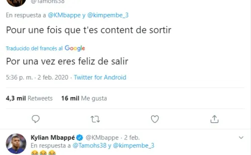 Una persona le comentó: “Por primera vez estás feliz por salir”. Mbappé le contestó rápidamente y con emojis riéndose.