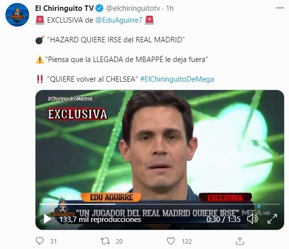 “Hay un jugador del Real Madrid que quiere irse. No es un jugador cualquiera sino uno de los más importantes de la plantilla. Una de las estrellas del equipo. Eden Hazard ha decidido marcharse y quiere irse del Real Madrid. Hazard no es feliz en España, es verdad que las lesiones no le han ayudado pero no es feliz, no se ha adaptado”, aseguraba Edu Aguirre en el programa de Pedrerol.